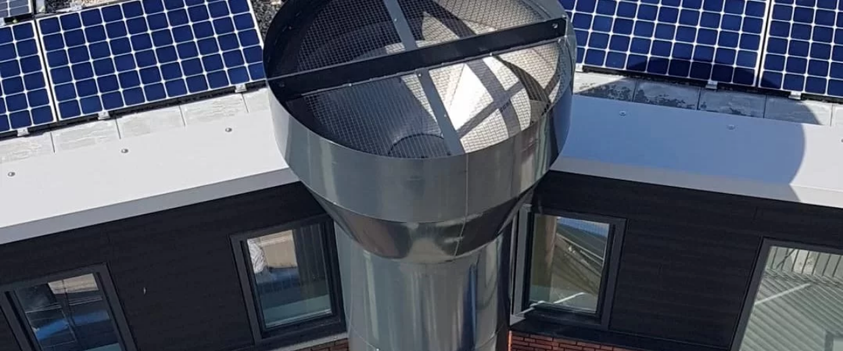 With the new construction of apartments in Zwolle, an accessory parking lot was in need of a vent stack for the ventilation of exhaust gasses of the cars to keep the ambient air in the garage fresh and healthy. The vent stack was planned to pass the building closely, so the appearance of the vent had to be taken into account. We have designed the air exhaust in such a way that it fits in well with the living environment and is in style with the apartment complex.